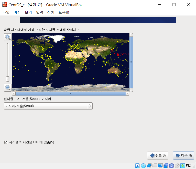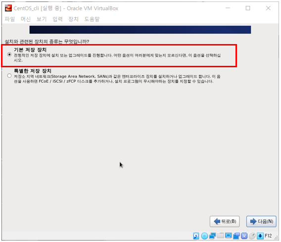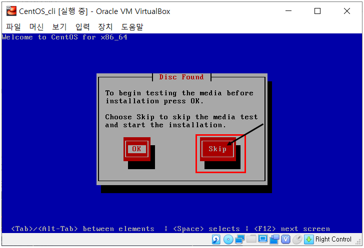 버추얼 박스에 CnetOS ISO 파일을 광디스크에 삽입하여 실행하면 위와 같이 선택화면이 나온다