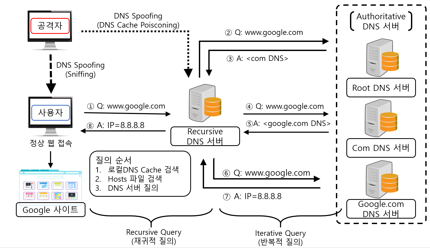 - Recursive 네임서버는 자신의 캐시 데이터를 조회한 후 데이터가 있으면 사용자 호스트로 그 결과를 반환하고 데이터가 없으면 최상위 Root 네임서버부터 질의 대상 도메인 네임서버까지 반복적 질의를 수행한 후 그결과를 사용자 호스트에 반환한다.