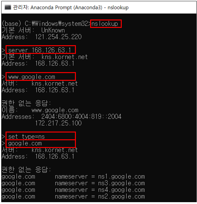 - nslookup [도메인] [네임서버]: 질의할 도메인을 지정한 네임서버로 질의