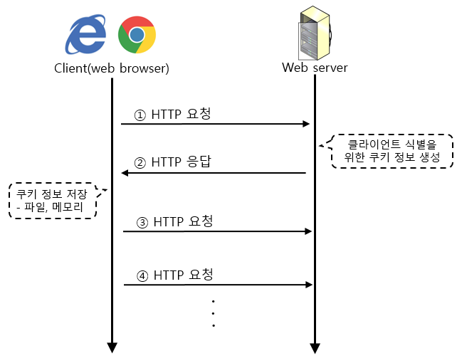 ② 서버에서 "Set-Cookie 응답헤더"를 통해 쿠키를 설정하여 클라이언트로 전달하면 클라이언트는 "Cookie 요청헤더"를 이용해 지속적으로 쿠키를 전달하는 형태로 동작한다.
