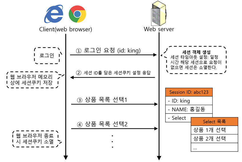 ② 서버는 개별 클라이언트 세션을 식별하기 위해 "세션 ID"를 부여하고 세션 ID는 세션 쿠키를 이용하여 클라이언트와 서버 간에 주고 받는다.