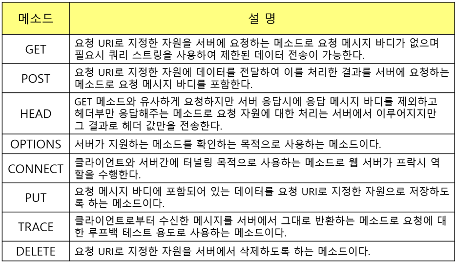 - 주로 80/tcp 포트를 사용하며 1991년에 HTTP 초기버전이 발표된 이후 1996년 1.0버전, 1999년 1.1버전이 발표되어 사용되고 있다.