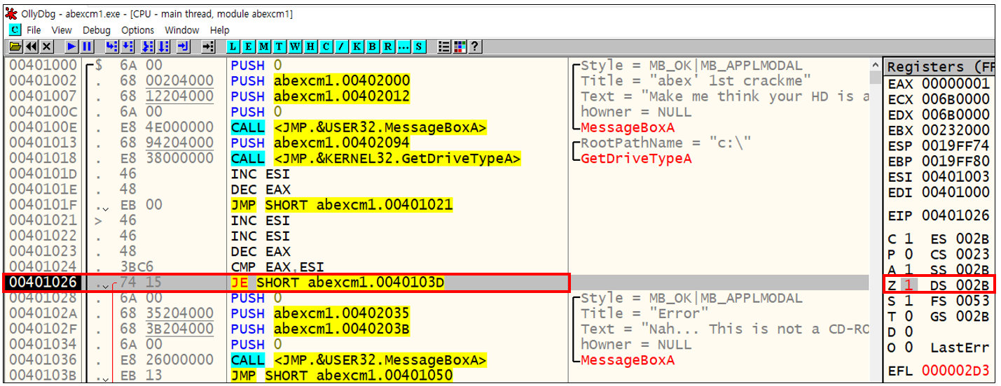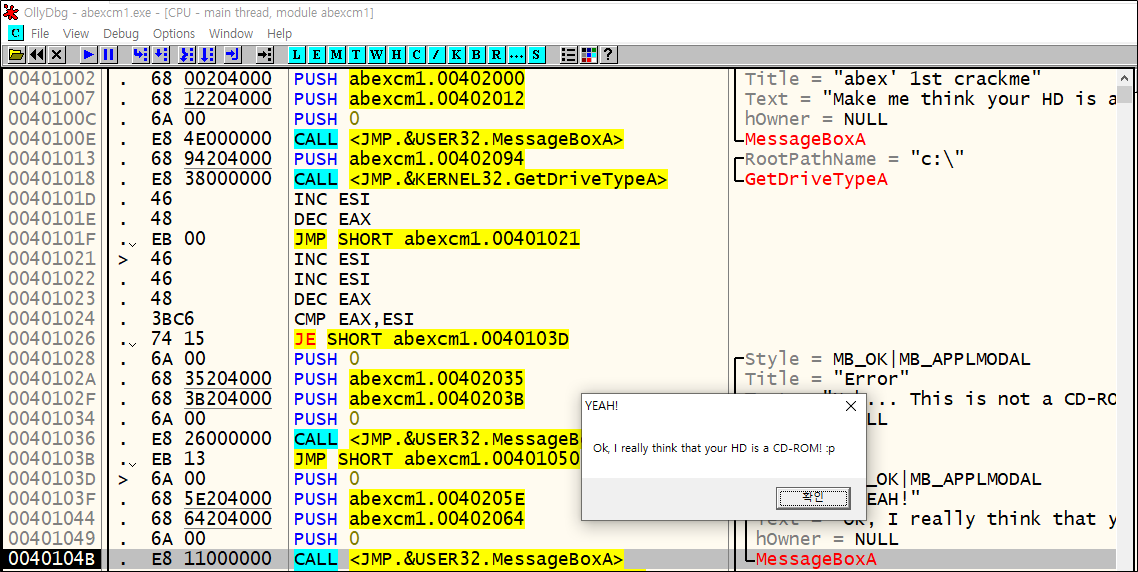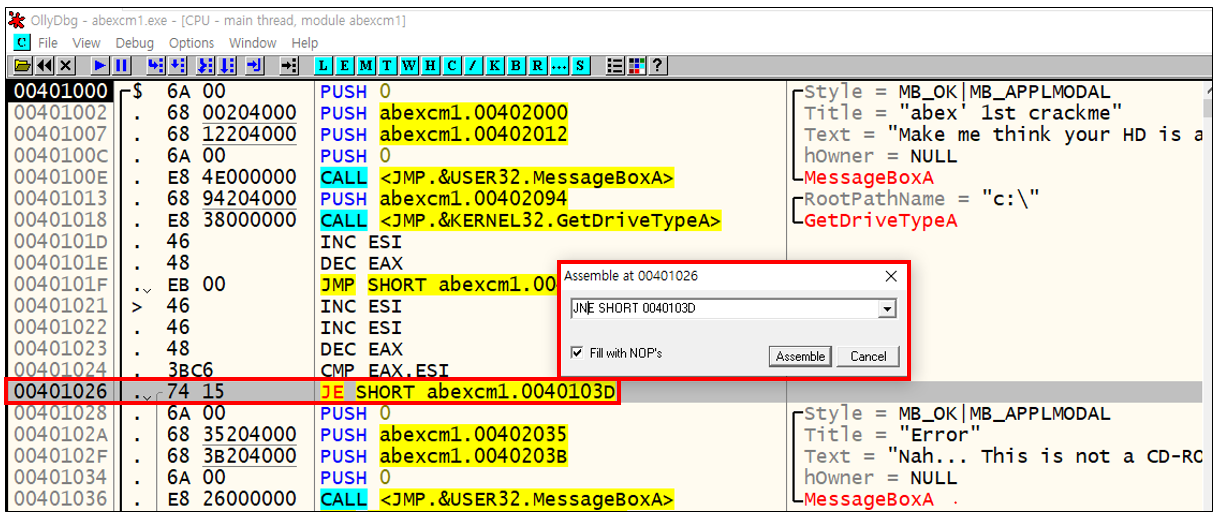 "JE SHORT abexcm1. 0040103D"의 내용을 "JNZ SHORT abexcm1. 0040103D" 또는 "JMP SHORT abexcm1. 0040103D" 으로 변경하여 프로그램을 실행해본다.