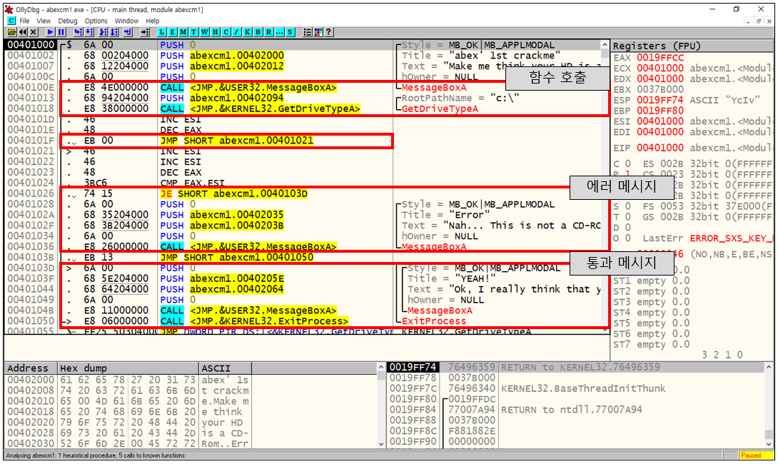 이 프로그램이 정상적으로 실행이 되려면 주소 "00401024"의 내용 "JE SHORT abexcm1. 0040103D" 분기문이 아래의 통과 메시지로 넘어가야한다. 그렇다면, 현재는 통과 메시지가 아닌 에러 메시지의 분기로 간다는 것이다. 그렇기 때문에 "JE" 분기문을 변경 한다.