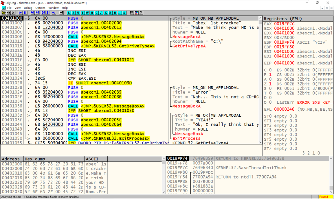OllyDbg에 실행파일을 로드했을때 나오는 화면이며 내용은 그렇게 길지 않은 프로그램인것을 알 수 있다.