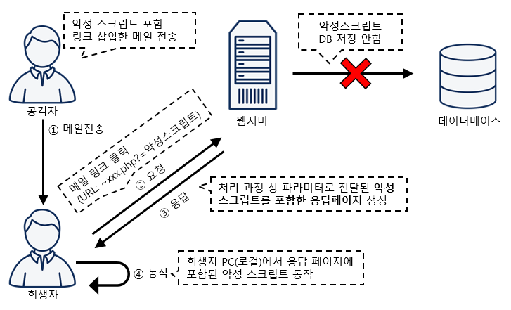 외부에 있는 악성 스크립트가 희생자 액션에 의해 취약한 웹서버로 전달되고, 웹서버의 응답 페이지에 해당 악성 스크립트가 삽입되어 희생자 측에서 동작하는 방식이다.