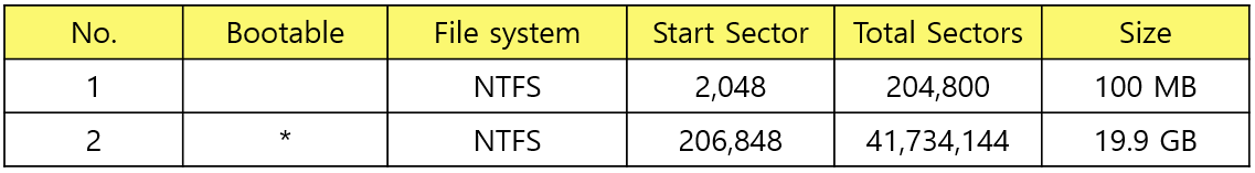 부트 파티션/NTFS /시작위치: 0x8000 sector(=0x1000000 bytes) / 크기: 0x32000 sector (=0x6400000 bytes = 104857600 bytes = 100MB) / Start CHS: 00 21 20 / End CHS: 0C 13 DF
