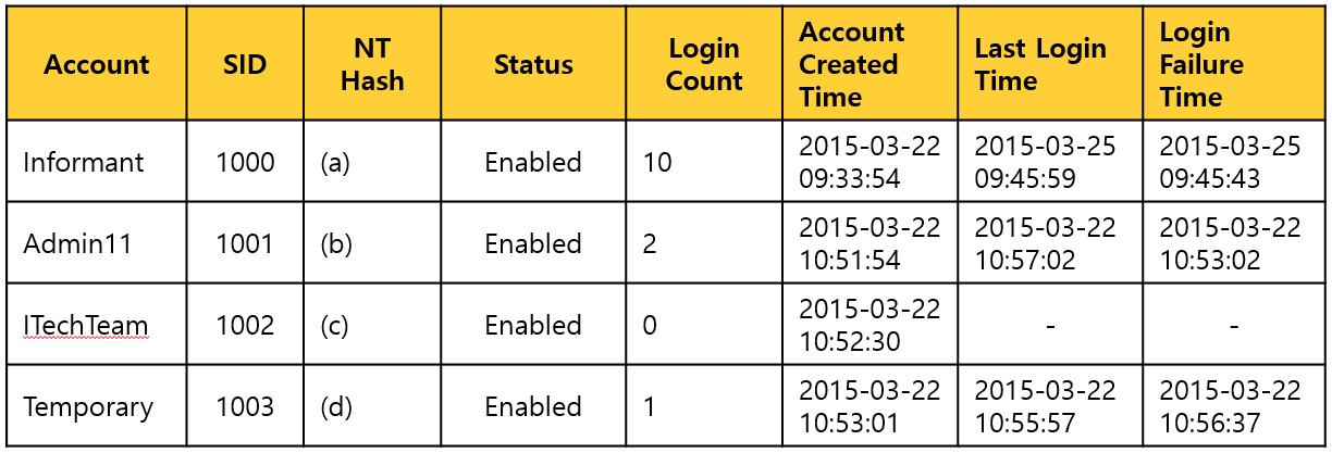 All accounts: informat, temporary, ITech, admin11, Guest, Administrator 위의 계정들에 해당하는 login count, last logon date, created on time, total login count, in valid login count 등이 있다.