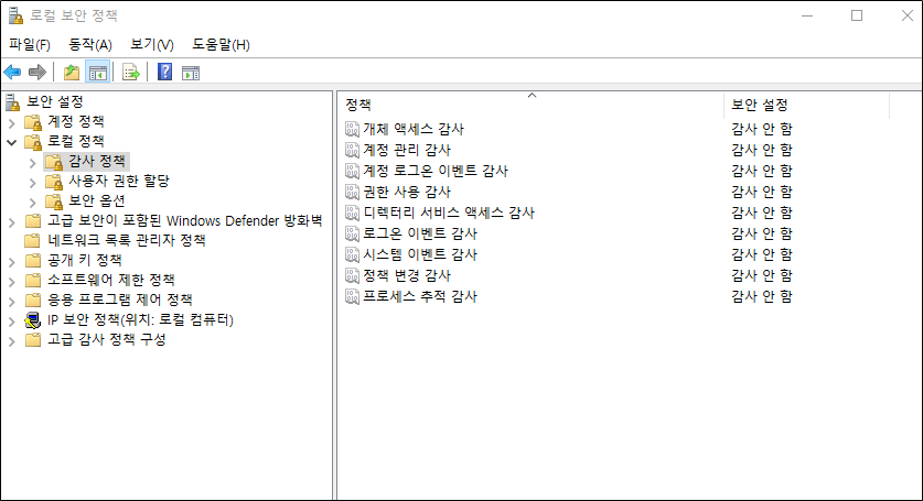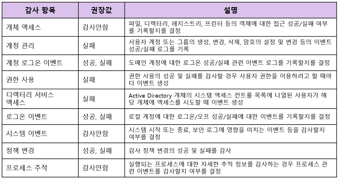 윈도우의 감사 정책은 어떤 로그를 남길지를 정의한 규칙을 말하며, 감사 정책을 설정하면 감사 정책에 의해 지정한 이벤트 범주에 대해서만 로그가 남는다.