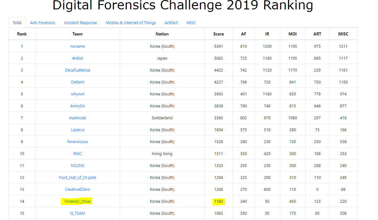 저 또한 이 대회에 "Forensic_Drive"라는 팀명으로 열심히 문제를 풀어 보았습니다만, 실력이 미흡하여 14위로 마무리해서 아쉽지만, 내년 2020년도에는 좀 더 적극적으로 참여하여 TOP10 순위권을 목표로 노력해 보려고 합니다.