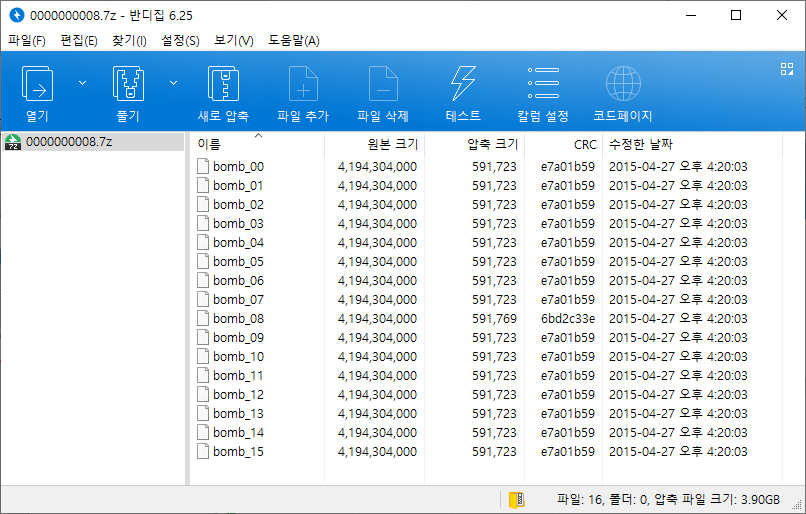 압축파일을 실행하면 위의 그림과 같이 16개의 파일들이 압축되어 있다. 그 중 특이한 점은 문제 파일로 제공된 파일의 용량은 10MB가 채 되지 않는 파일이었지만, 현재 위의 그림과 같이 압축된 파일들이 모두 동일하게 파일 용량이 4.2GB나 되어 해당 파일은 ZipBomb으로 예상된다.