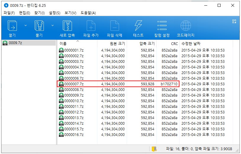 이번에도 다른 파일들과는 다른 압축된 크기, CRC 정보를 갖는 파일이 존재한다. 이전 압축파일과 동일한 방법으로 CRC 정보가 다른 압축파일 0009.7z를 압축해제하여 확인한다.