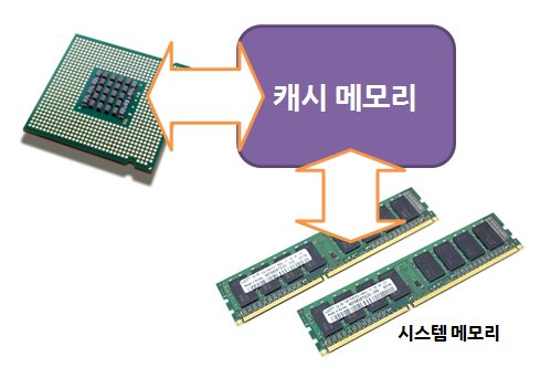 - 컴퓨터에서 CPU와 주기억장치 사이에 설치되어 있는 고속 버퍼 메모리, 빈번히 사용되는 명령이나 데이터를 빠르게 처리하기 위한 메모리