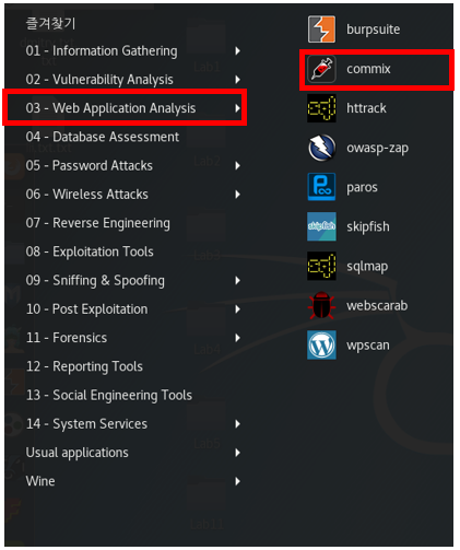 commix 실행순서: 프로그램 > 즐겨찾기 03 - Web Application Analysis > commix