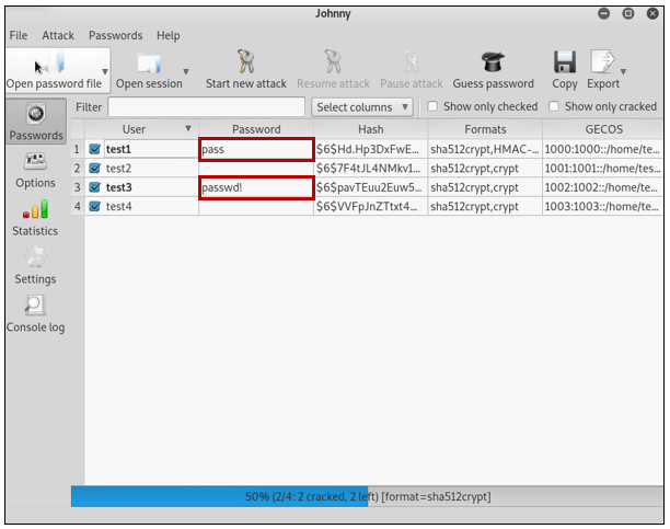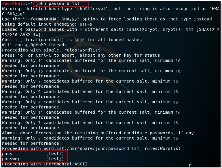 연뒤, password 파일의 test 사용자들이 지금 크랙중인 화면을 볼 수 있습니다.