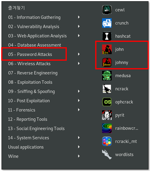 john 실행순서: 프로그램 > 즐겨찾기 05 - Password Attacks > john
