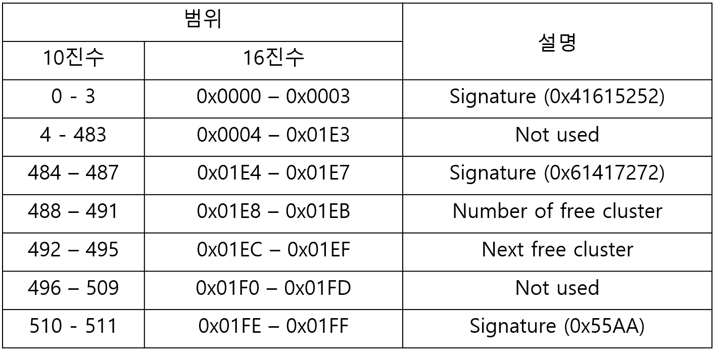 - FSINFO는 일반적으로 1번째 섹터(부트 섹터 다음)에 저장되는 구조로 7번째 섹터에 내용을 백업