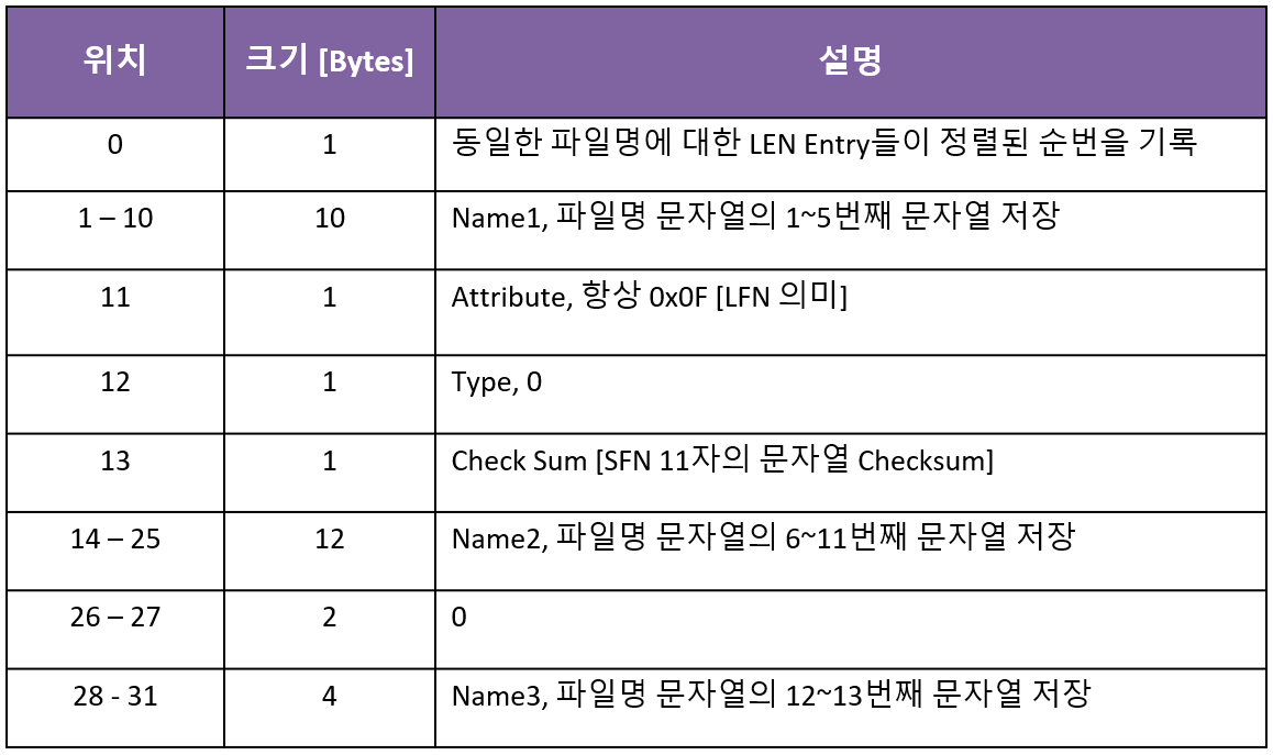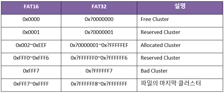 - FAT Entry에 저장되는 값은 다음 클러스터 값 저장