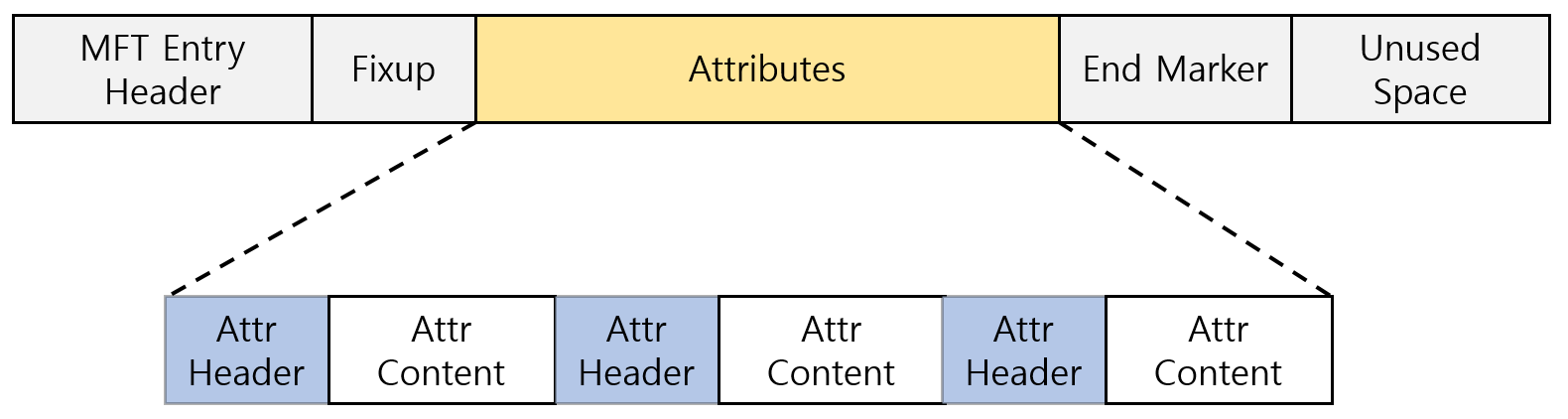 -MFT 엔트리는 다음 그림과 같은 구조를 가진다. 맨 앞부분에 48 바이트 크기의 엔트리 헤더와 Fixup 값, 그리고 해당하는 파일의 특성에 따라 여러 개의 속성을 가진다.