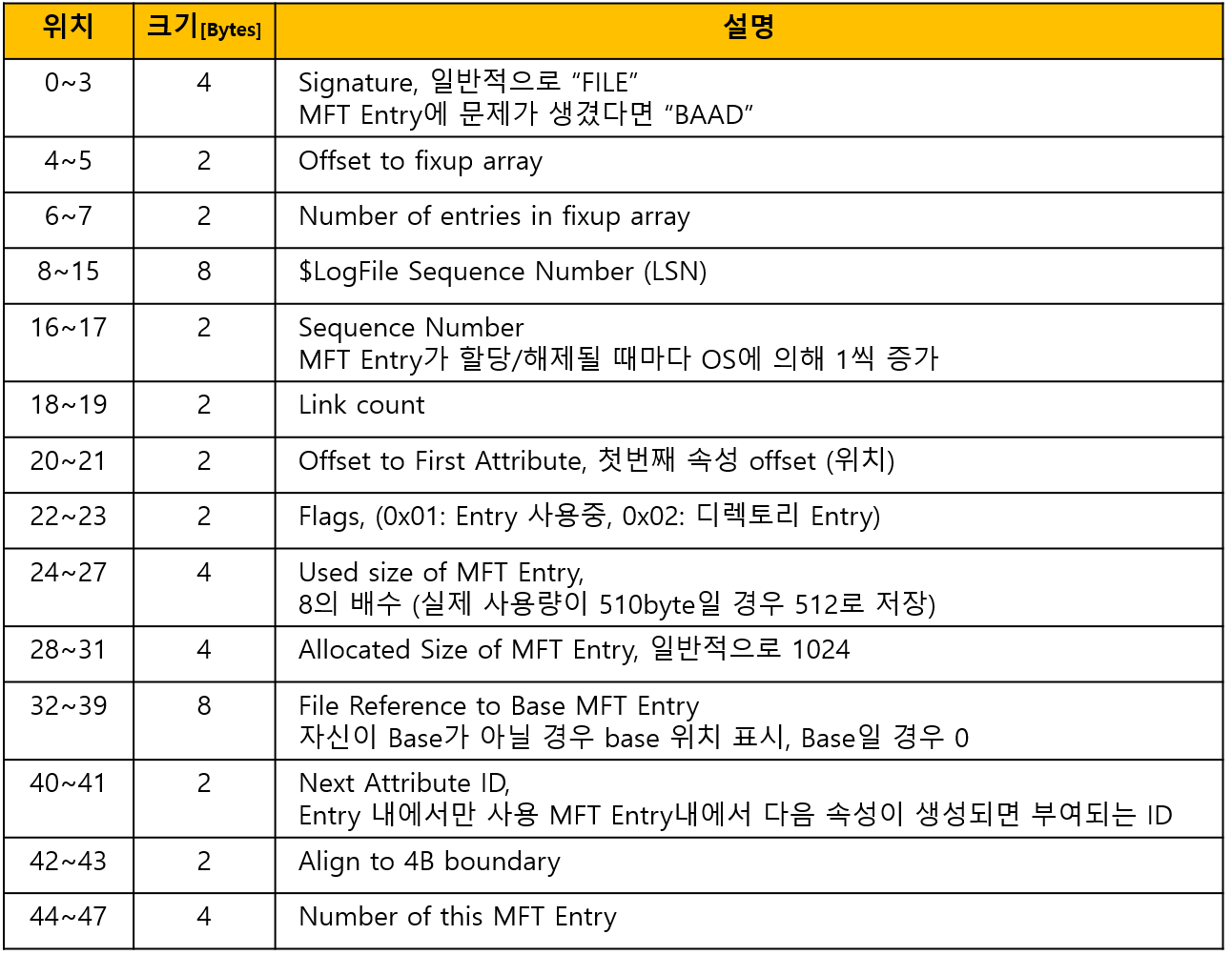 - Non-base MFT Entry: 두번째 이상의 MFT Entry