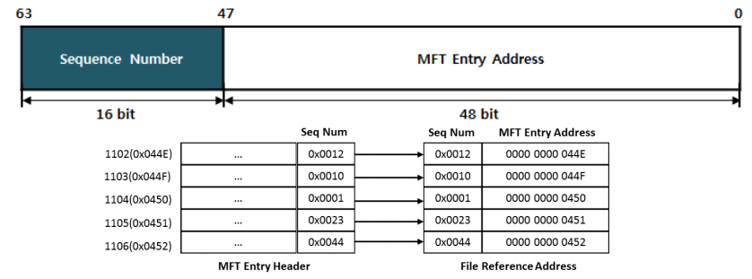 - File Reference Address(64bit) = Sequence Number(16bit)와 MFT Entry Address(48bit)의 조합 사용