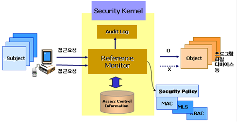 참조모니터는 보안 운영체제에서 주체와 객체사이의 정보 흐름을 감시하는 보안모듈로 주체와 객체의 접근권한을 정의한 보안 커널 테이터베이스를 참조하여 보안정책을 수행한다.