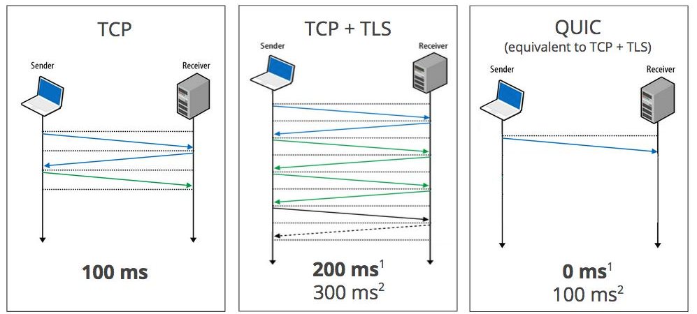 QUIC은 HTTP 2.0에서 TCP+TLS(3-Way Handshake 과정)에 해당하며, 보안 및 향상된 성능을 제공하는 UDP 기반 전송 계층 프로토콜이다.