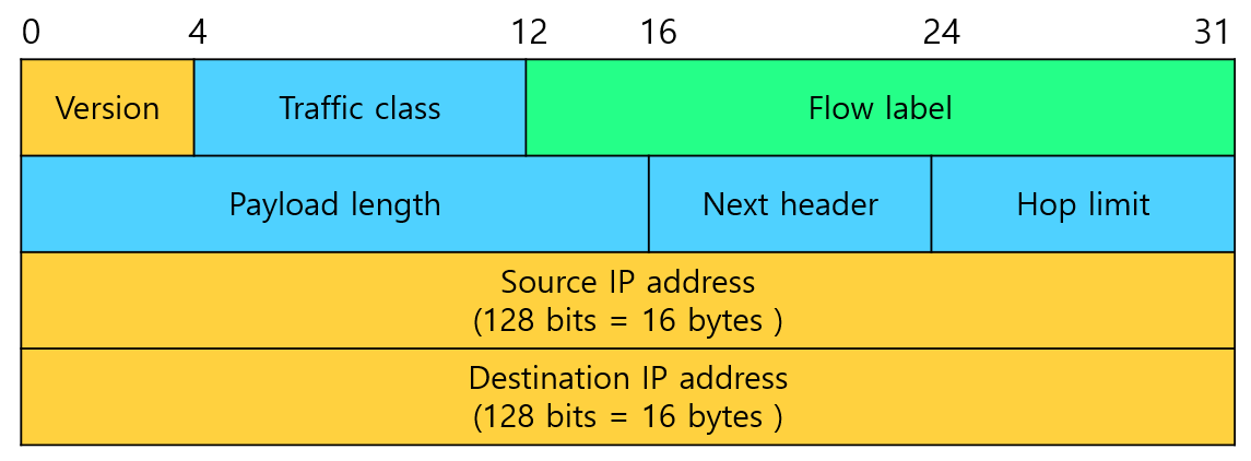 IPv6는 기본 헤더의 길이가 40바이트의 고정되어 있어 페이로드의 길이만 정의하면 된다.
