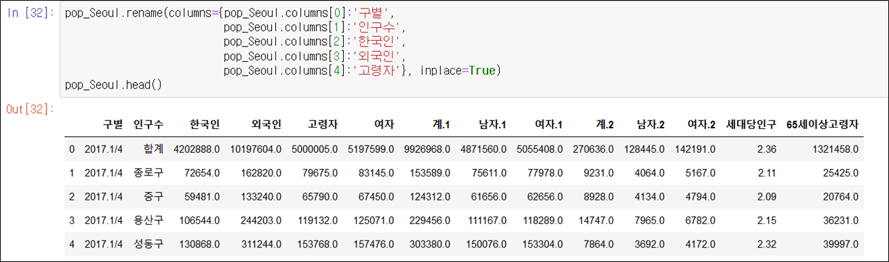 컬럼의 내용을 (구별, 인구수, 한국인, 외국인, 고령자)로 설정하여 출력하였습니다.