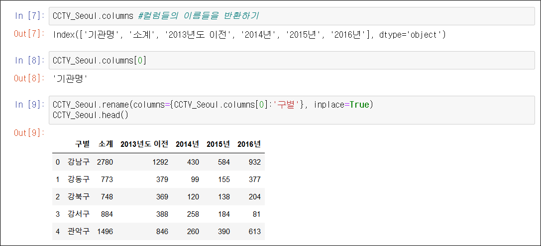 컬럼의 이름을 반환하는 columns 명령어를 이용하여 출력하였습니다.