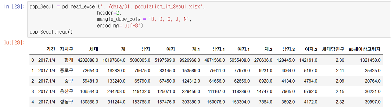 population_in_Seoul인 엑셀파일을 읽어서 세번째 줄부터 읽어라는 header=2의 명령어를 작성하였습니다.