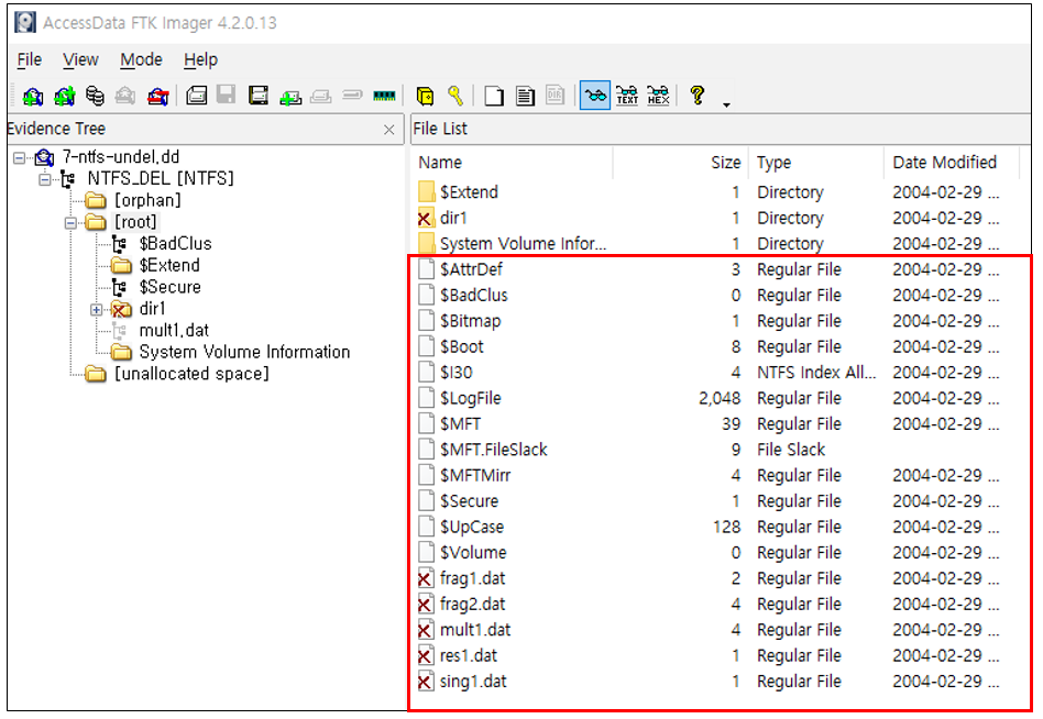 - NTFS 파일시스템 관리 파일로 예약되어 있으며 MFT Entry Number 0부터 15번까지 총 16개가 존재