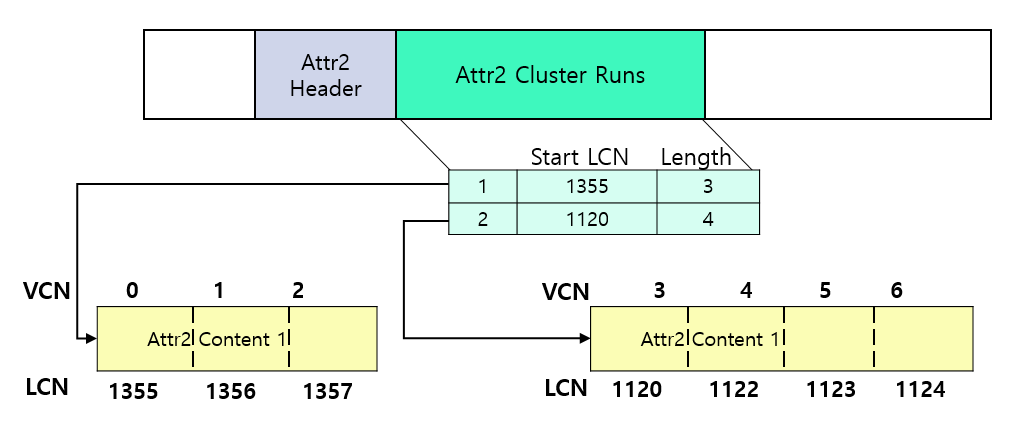 - Non-Resident 방식으로 속성의 내용이 저장되어 있는 경우 MFT Entry의 Attribute Content에 Cluster Runs 구조를 통해서 실제 속 성 내용의 클러스터 위치 확인